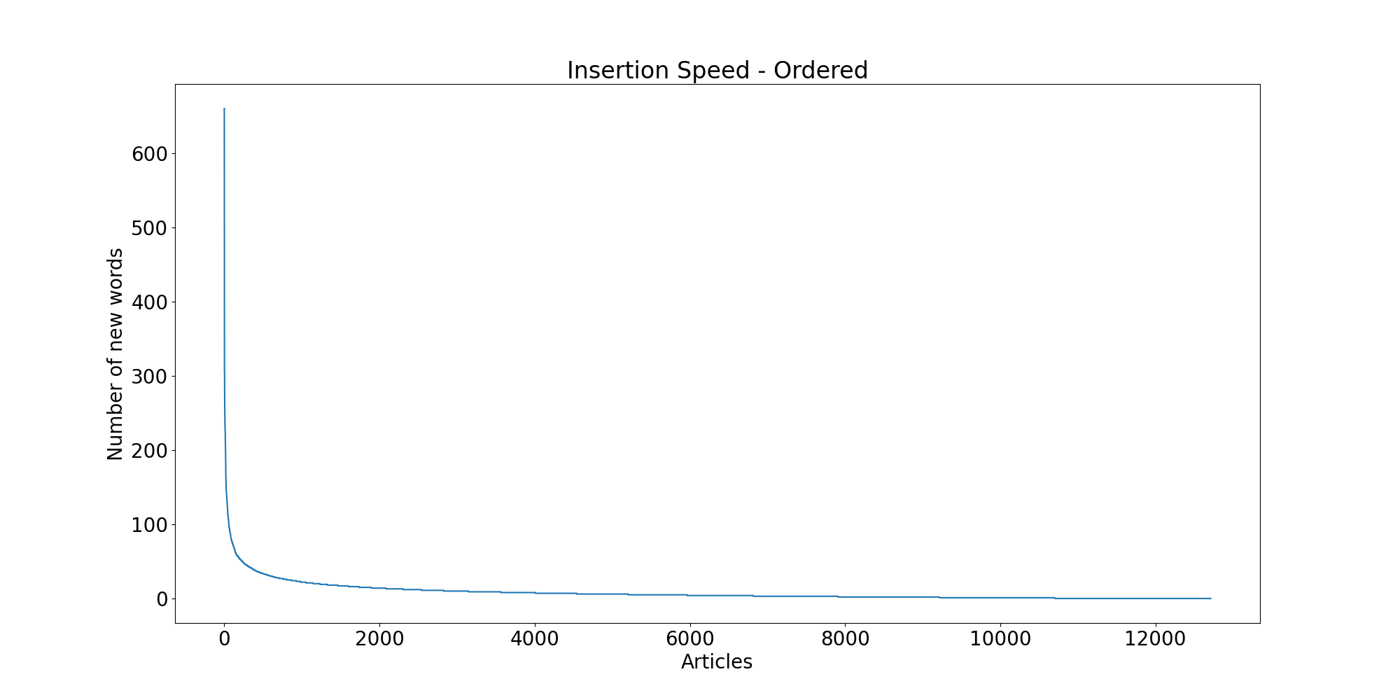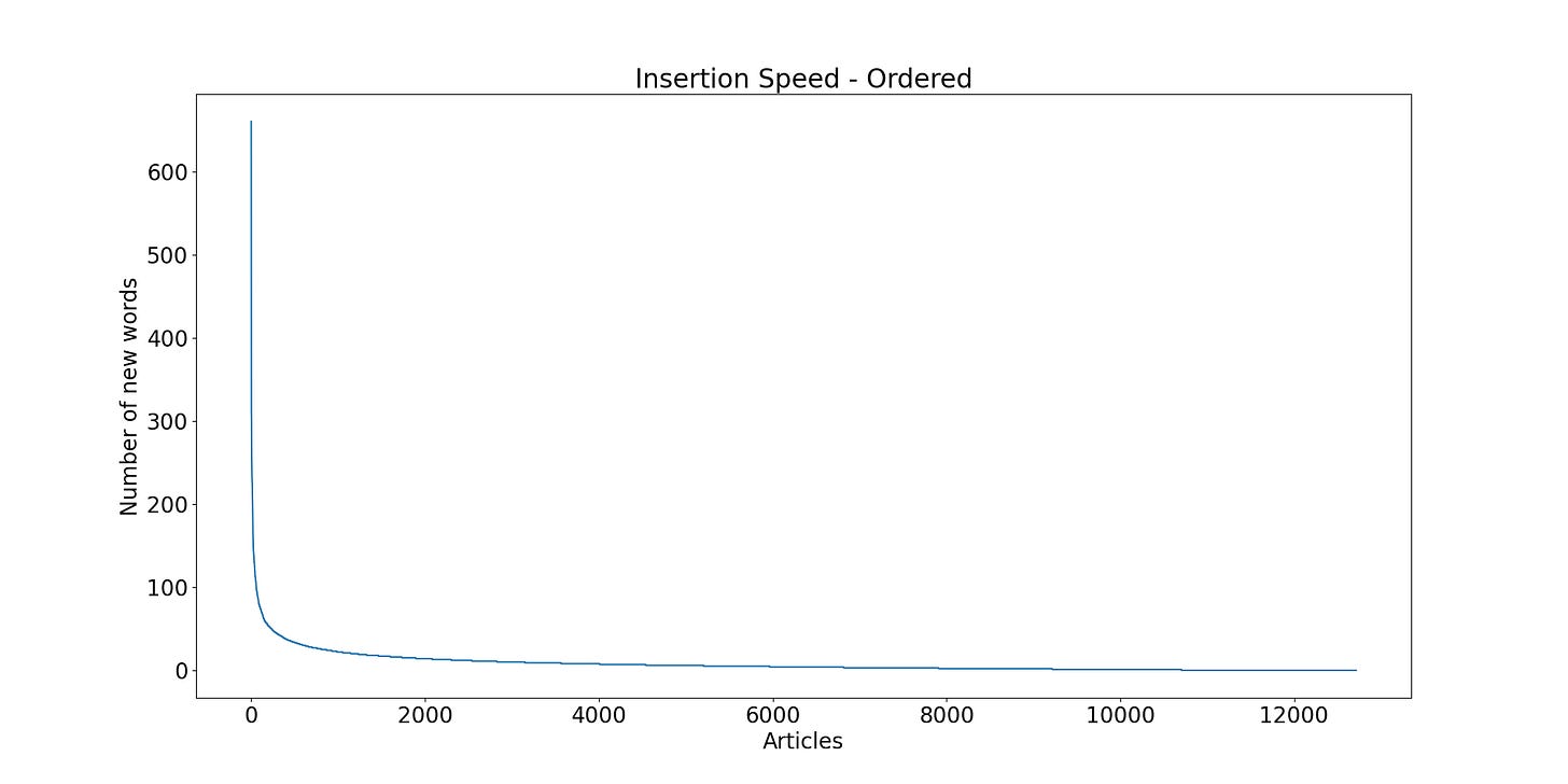 Another issue of interest for me is: how many articles I do need to read in order to have been exposed to most of the words? I rephrased this problem in what I call the ‘insertion speed’: how much each article contribute with new unique words?